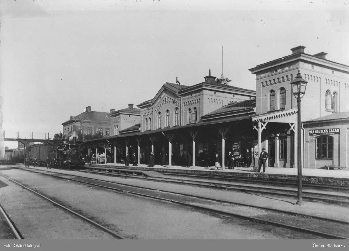Passagerare inväntar ånglok med vagnar vid Örebro Centralstation, 1880-tal