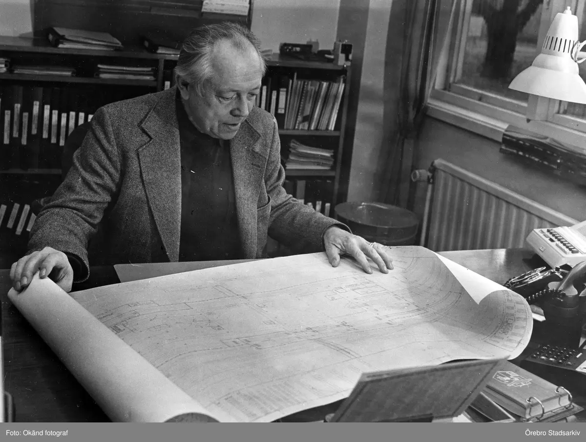 Ingenjör Rune Eriksson studerar ritning på Centralverkstäderna, 1970-tal