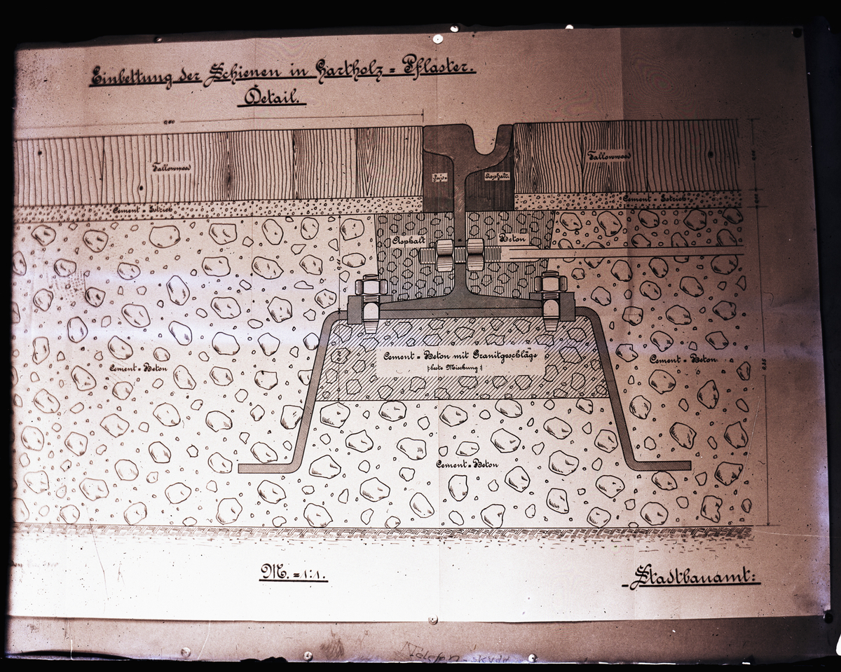 "Einbeltung der Schienen in Hartholz = Pflaster."