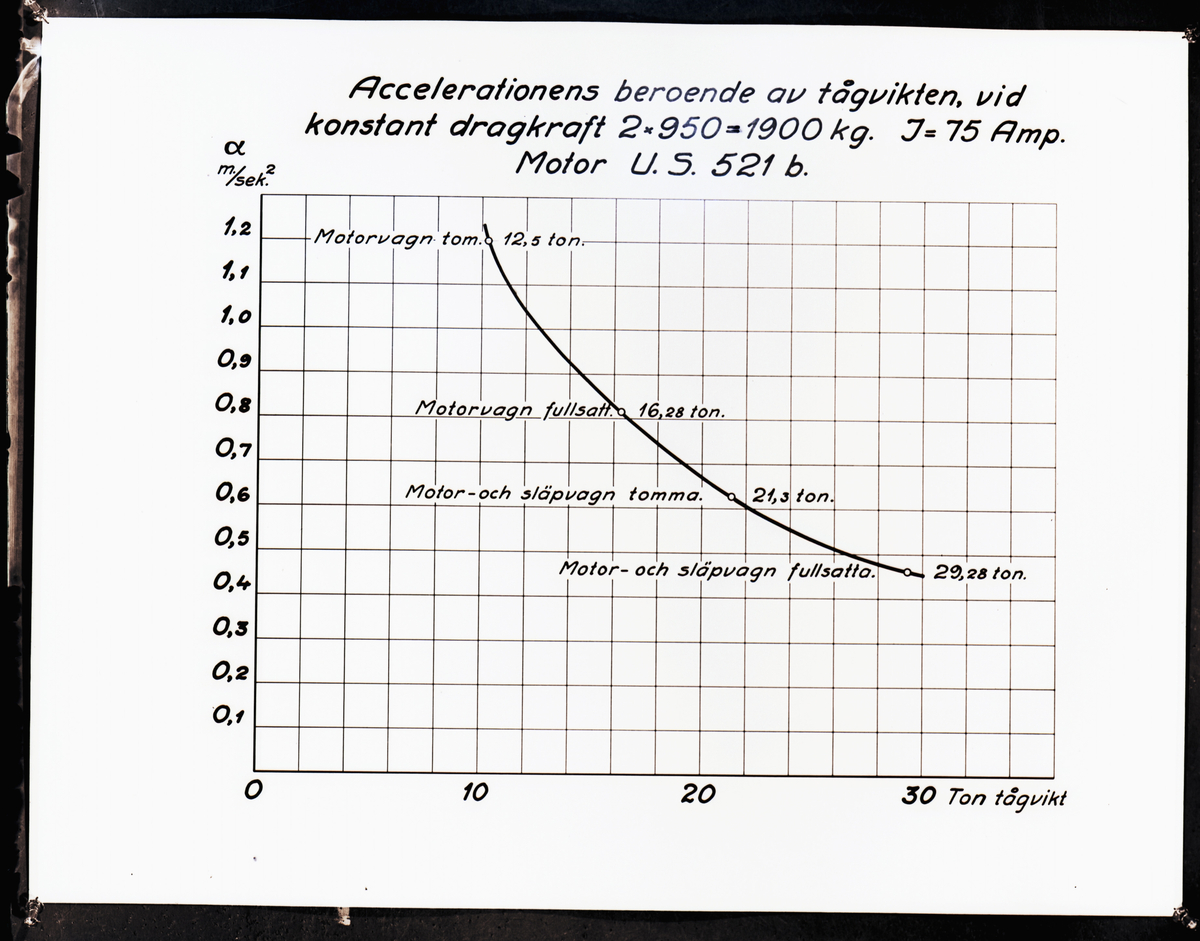 "Accelerationens beroende av tågvikten vid konstant dragkraft... (diagram)."