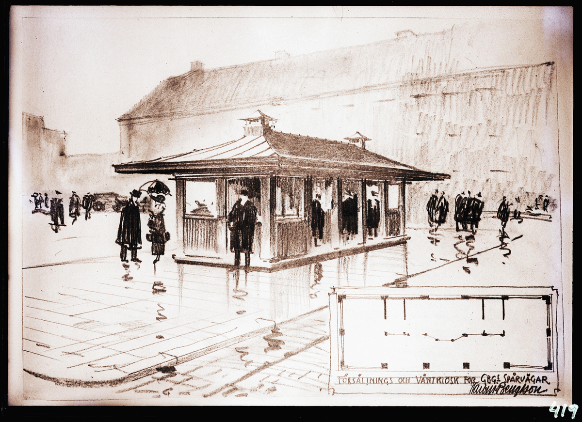 "Försäljnings- och väntkiosk för Göteborgs Spårvägar (ritning)."