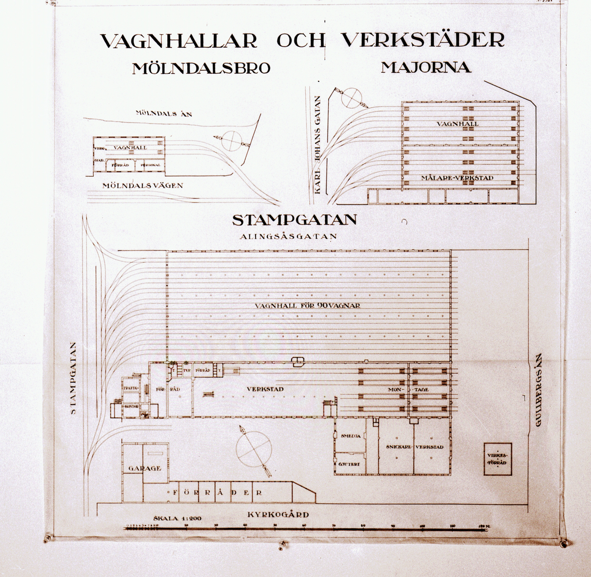 "Vagnhallar och verkstäder - Mölndalsbro, Majorna och Stampgatan (ritning)."
