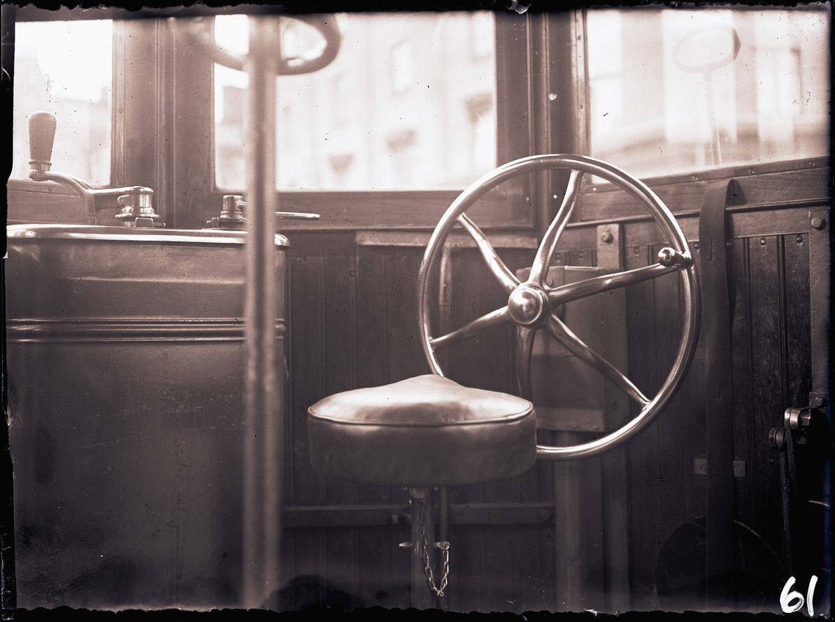 Motorvagnsförarplats. Före 1928 stod de upp sedan fick förarna en cykelsadel att sitta på.