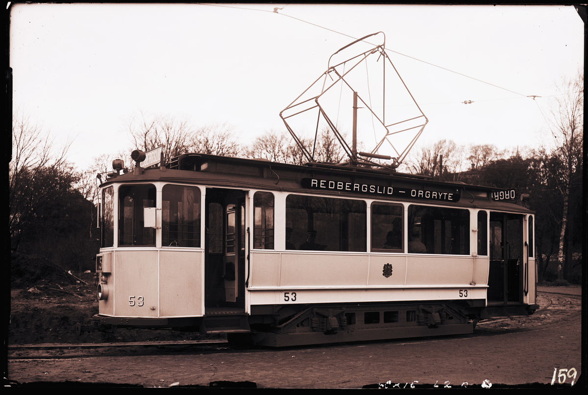 "Motorvagn med förlängd plattform. Vagn nr 53 snett framifrån med dubbeldörr å