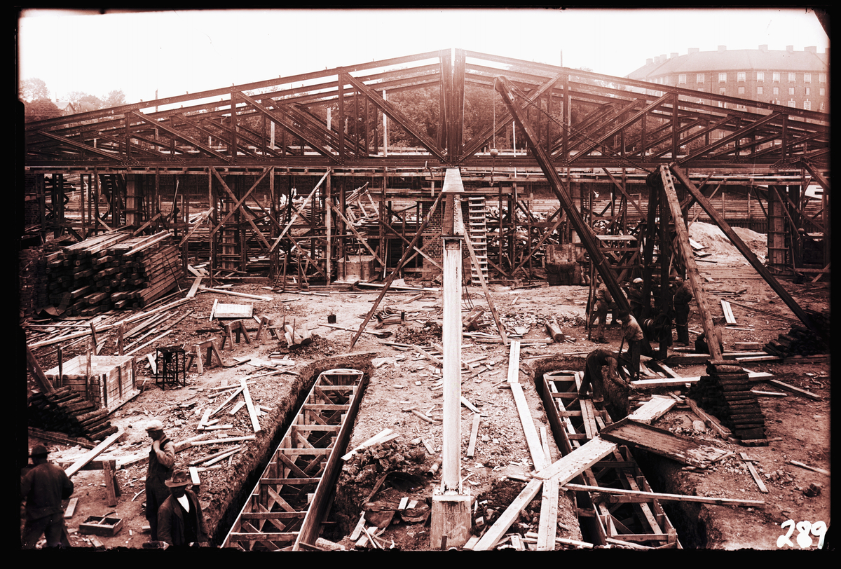 "Garage Friggagatan. Sydvästra gaveln - interiör under byggnadens uppförande