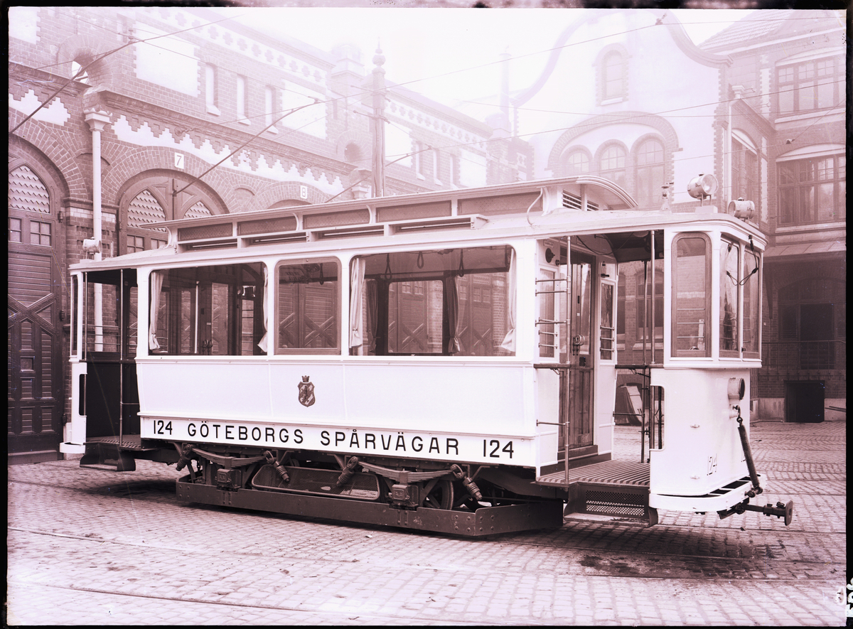 "Täckt släpvagn nr. 124, inbyggd plattform utan dörr."