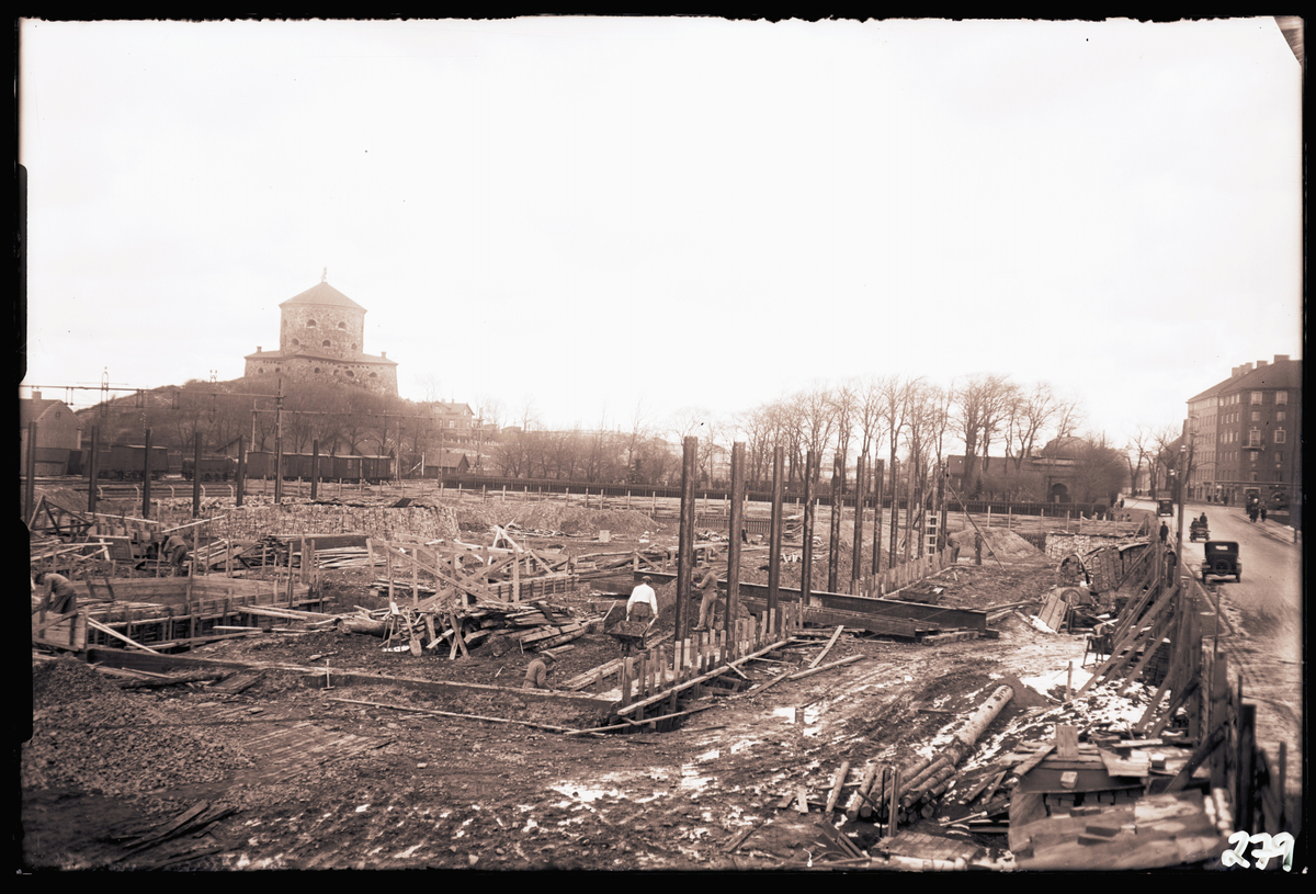 "Garage Friggagatan, syd östra fasaden med resta järnpelare."