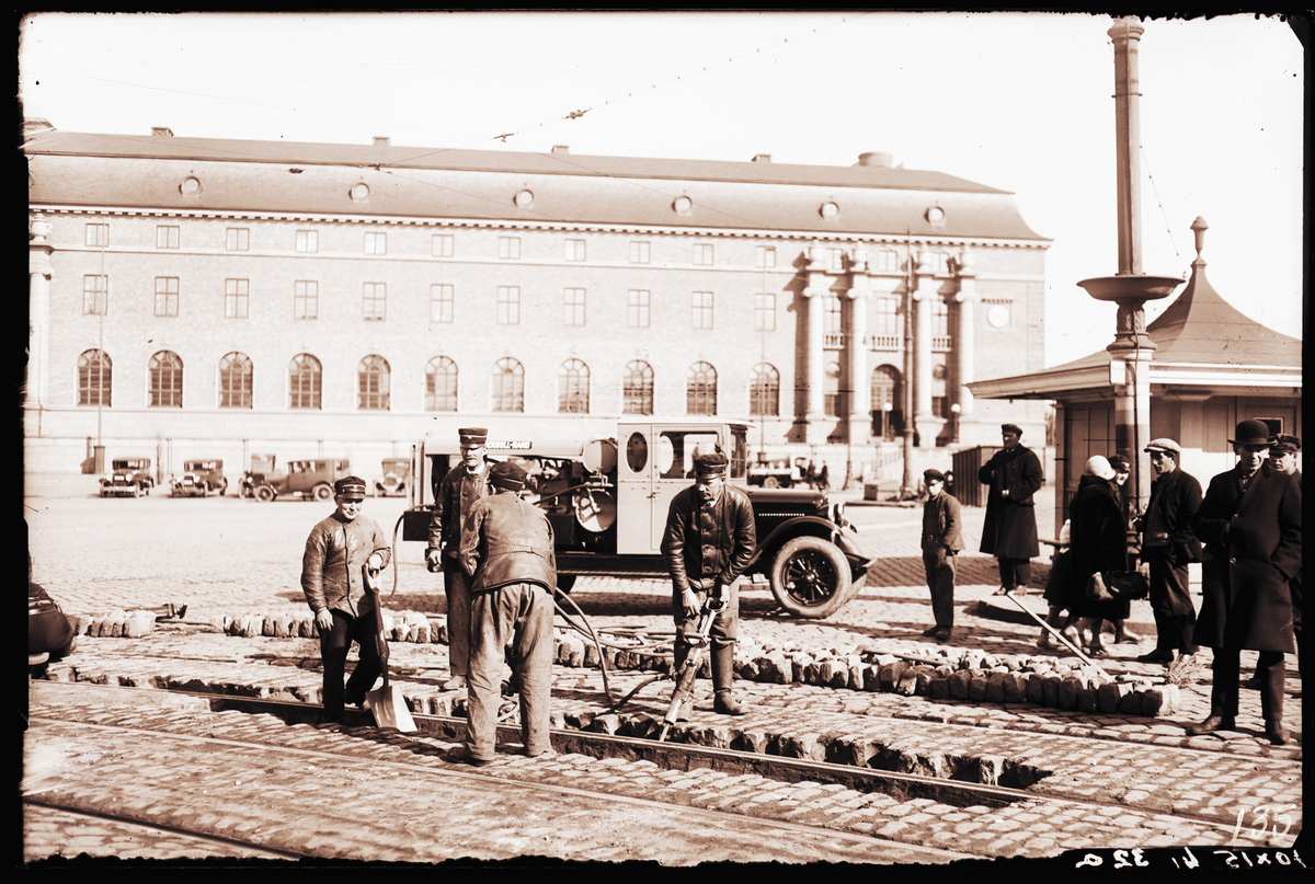 Titel: "Stoppningsaggregat (Ingersoll-Rund) å Drottningtorget, i arbete." 1928.