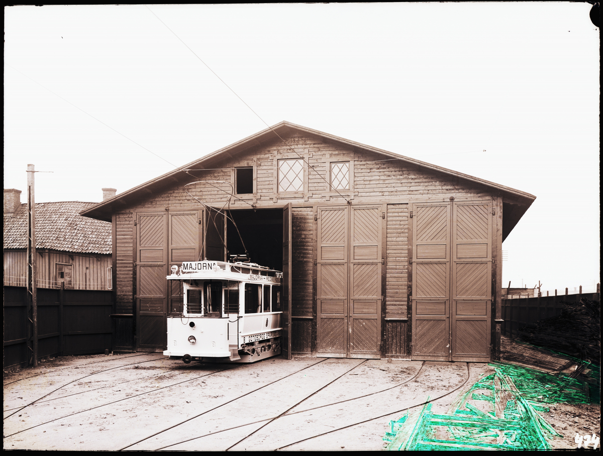 "Motorvagn nr. 8, öppen plattform, på väg in i eller ut ur hallen." 1902.