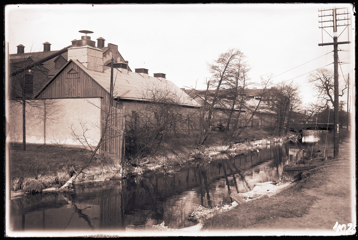 "Förrådsbyggnader för verkstad på Stampgatan sedda från Gårda, 11/2 1932."