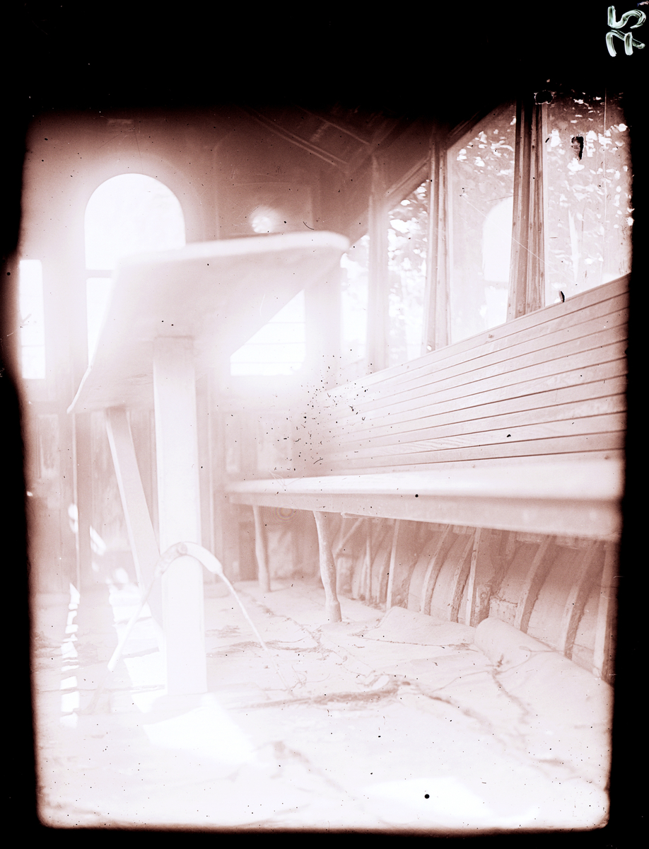 "Gammal hästspårvagn vid Frölunda smedja sommaren 1922. Interiör."
