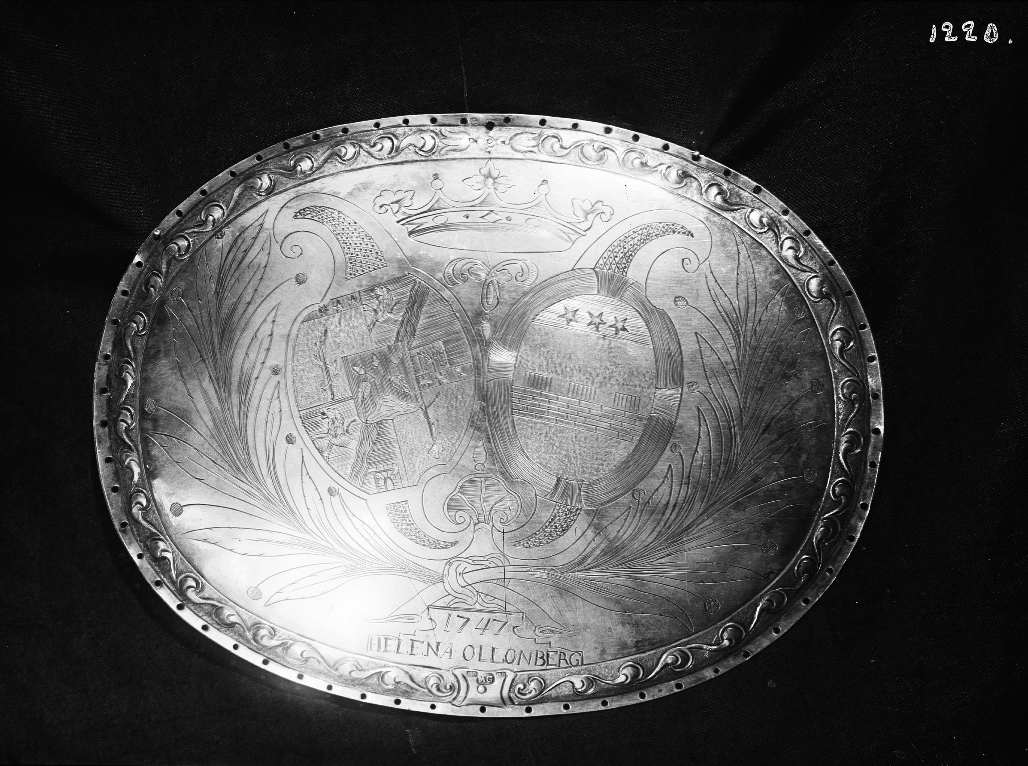 Kistplåt?, silver, med inskrift: 1747 Helena Ollonberg.