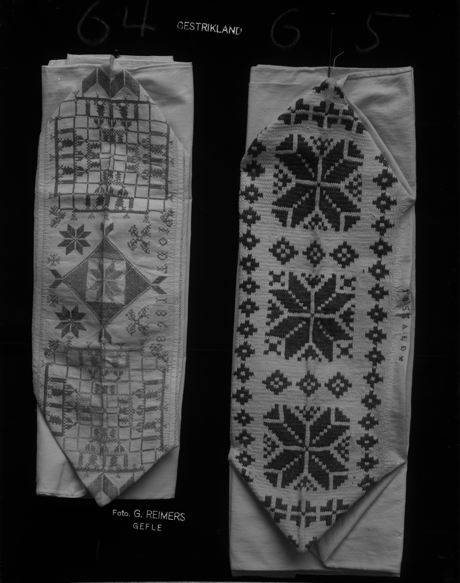 Örngott med örngottshuvor, en broderad i korssöm (64), en stickad med motiv av bl a tre åttabladiga stjärnor (65).