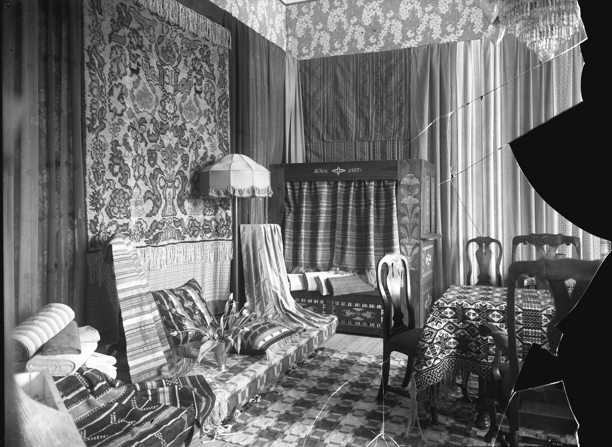 Bord, stolar, dekormålad säng märkt "Anno 1928", lampa, prydnadsrya, mattor, kuddar, täcken, gardiner, metervaror.
