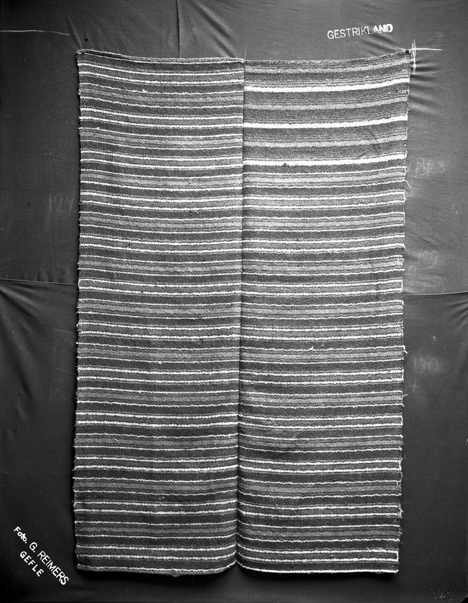 Randigt täcke vävt i rosengång, hopsytt av två våder. (182)