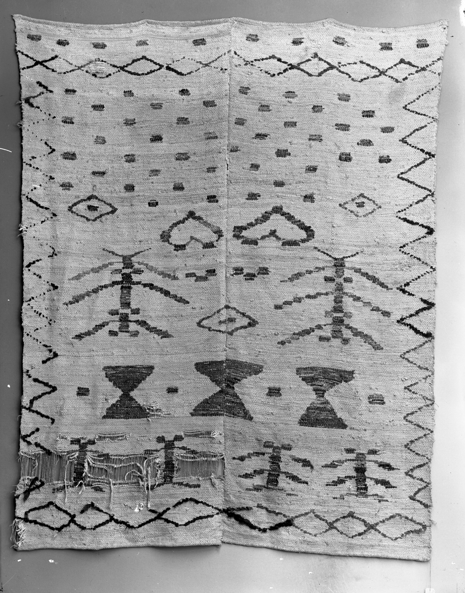 Täcke vävt i slarvtjäll. Mönster av timglas, träd, hjärtan och romber mm.