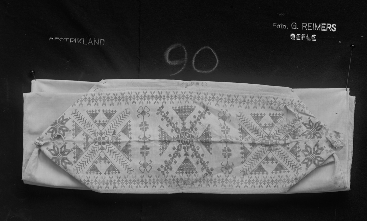 Örngott med örngottshuva broderad i korssöm, märkt "1849 med" i korssöm.