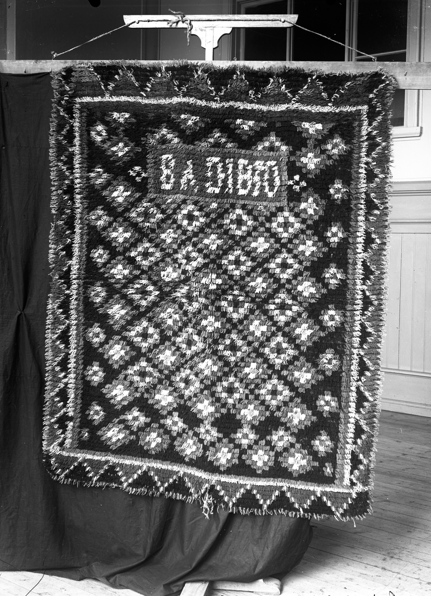 Garnprov i kuvert med följande information: Rya, flossa, 136 x 153 cm, 20 rör på 10 cm, varp linne, inslag hårgarn, mönstergarn 2 trådigt ullgarn, Nockans längd utanför knuten 2cm, trådantal i nockan 2, inslag mellan nockraderna 15mm.