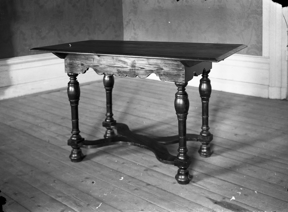Bord, rektangulärt med svarvade ben och två slåar mellan benen.