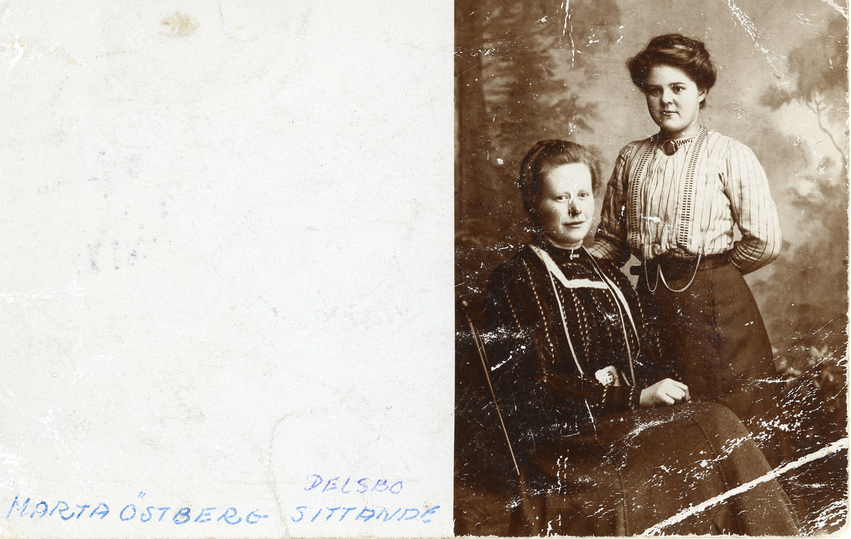 Ett brevkort med bild på Marta Östberg sittande, Delsbo.