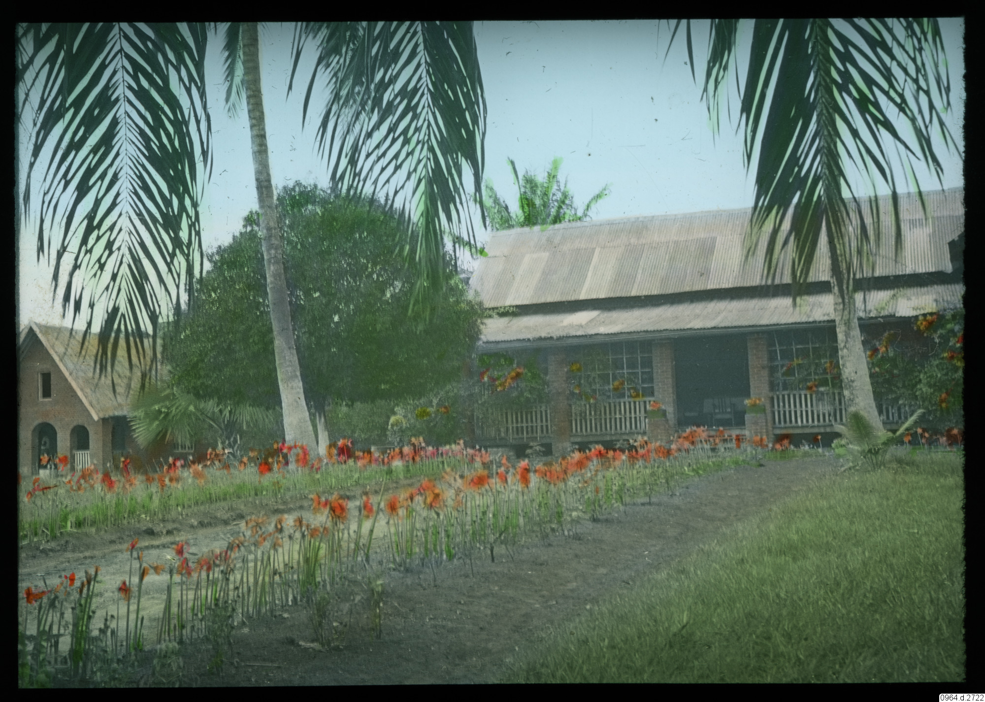 missionsstation, byggnad, bostad, kontor, blommor, palm, fotografi, photograph