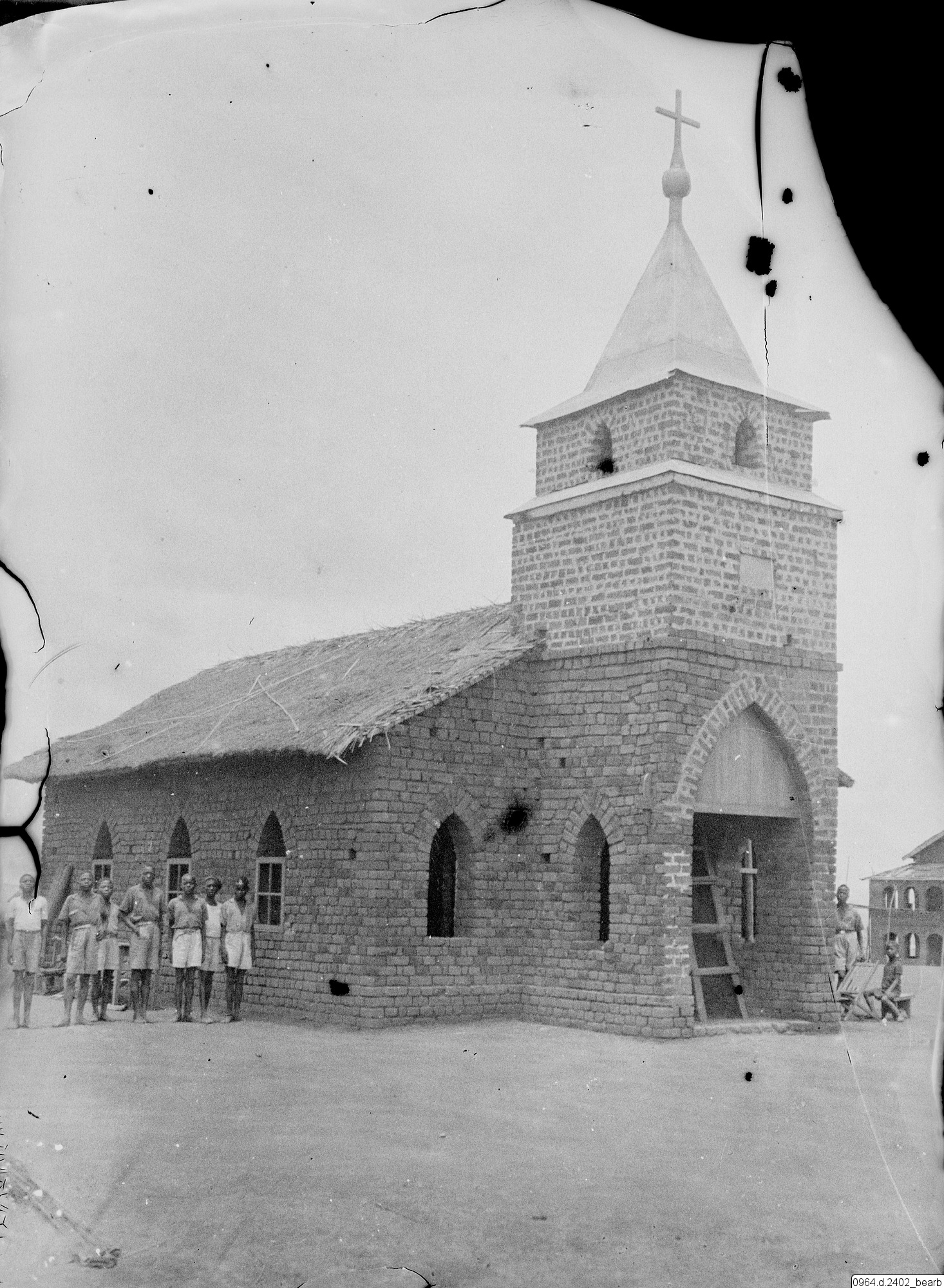 Kyrka och grupp av elever (?) utanför. Kapellet i Fadi (eller Tadi?)? Jämför bild 0964.9240.