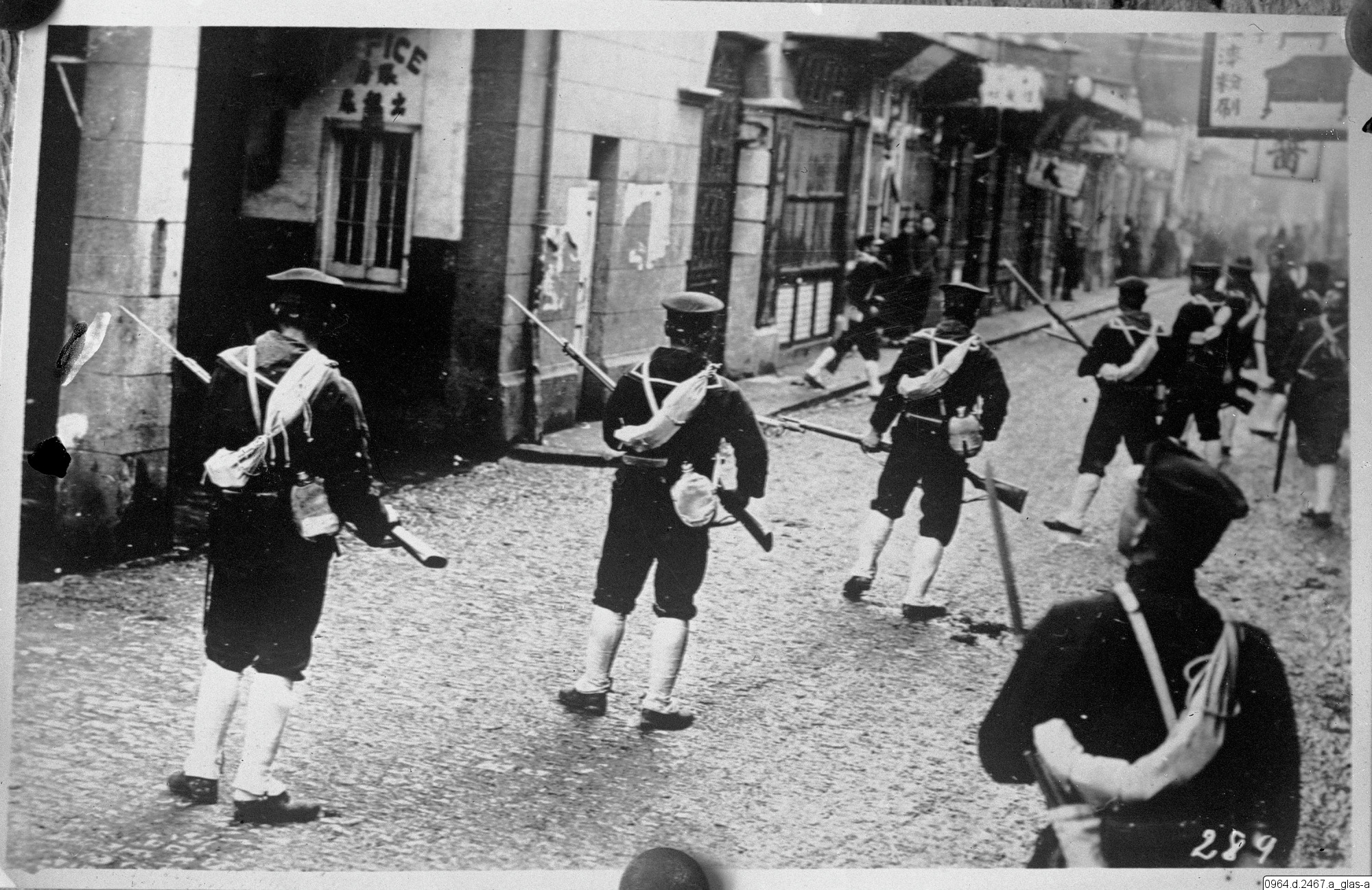 Shanghai 1927. Soldater med bajonett på gevär gående längst med en gata.