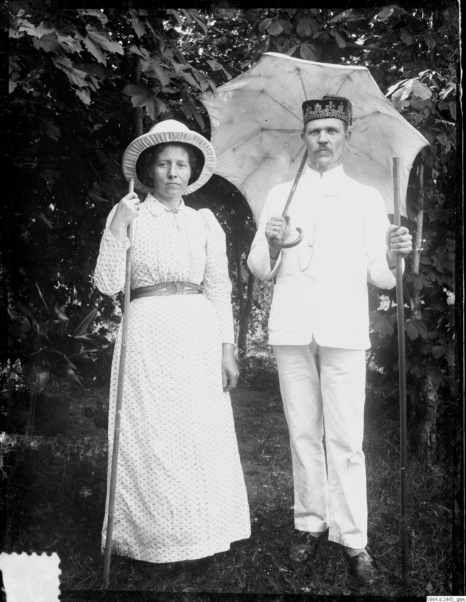 porträtt, paraply, man, tropikhjälm, käpp, kvinna, fotografi, photograph