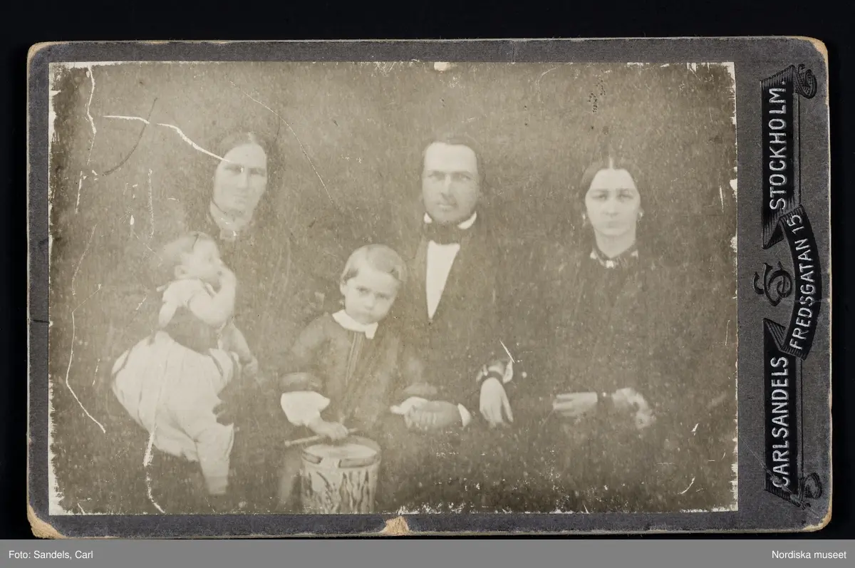 Gruppbild, familjeporträtt. En man, två kvinnor och två barn. Text på baksidan "Min far o Mor, Farmor. Bror o syster. Gottfried o Vendela. Farmor Brita Lovisa Hofgren f. Spaak."