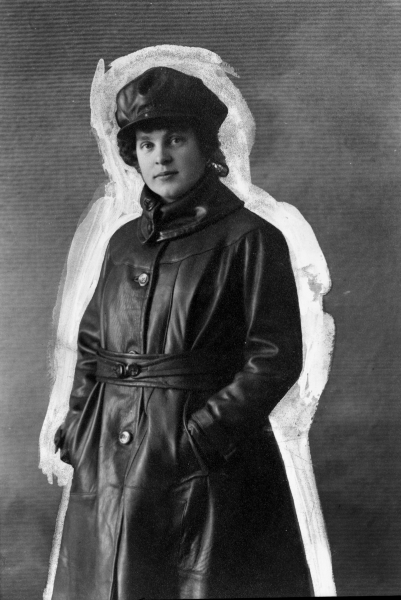 Aug Huzells AB.Kvinna i kappa och mössa av skinn.