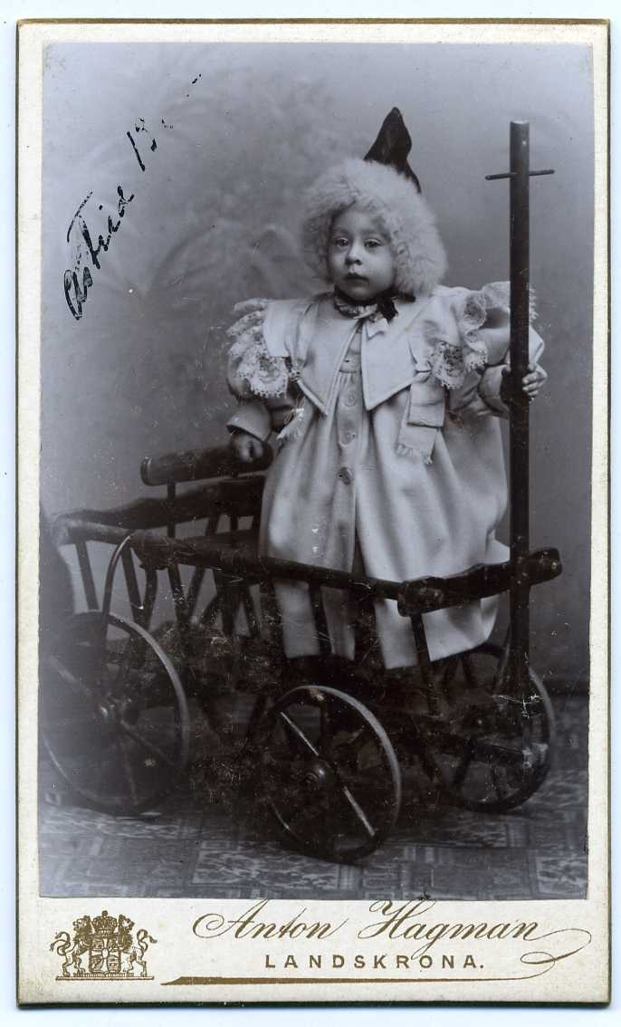 Porträtt av en 2-årig flicka som står i en skrinda.