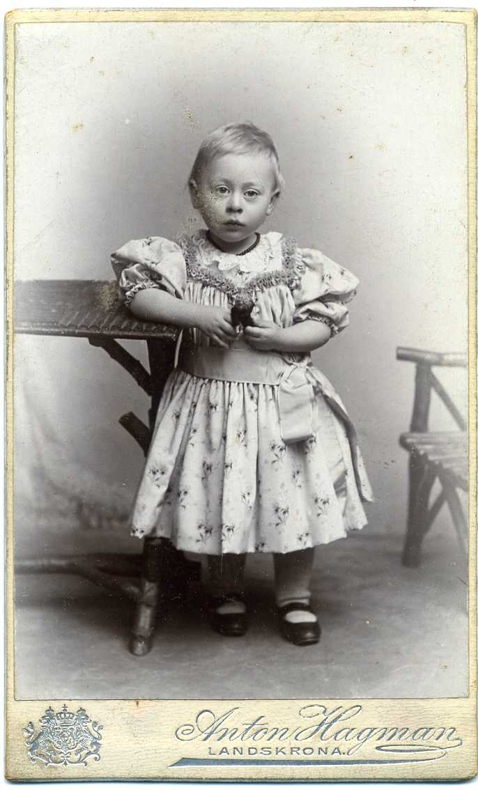 Porträtt av en liten flicka som står vid ett trädgårdsbord.