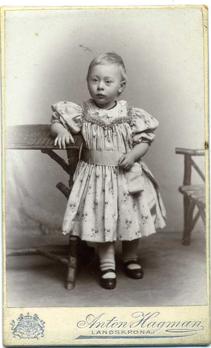 Porträtt av en liten flicka som står vid ett trädgårdsbord.
