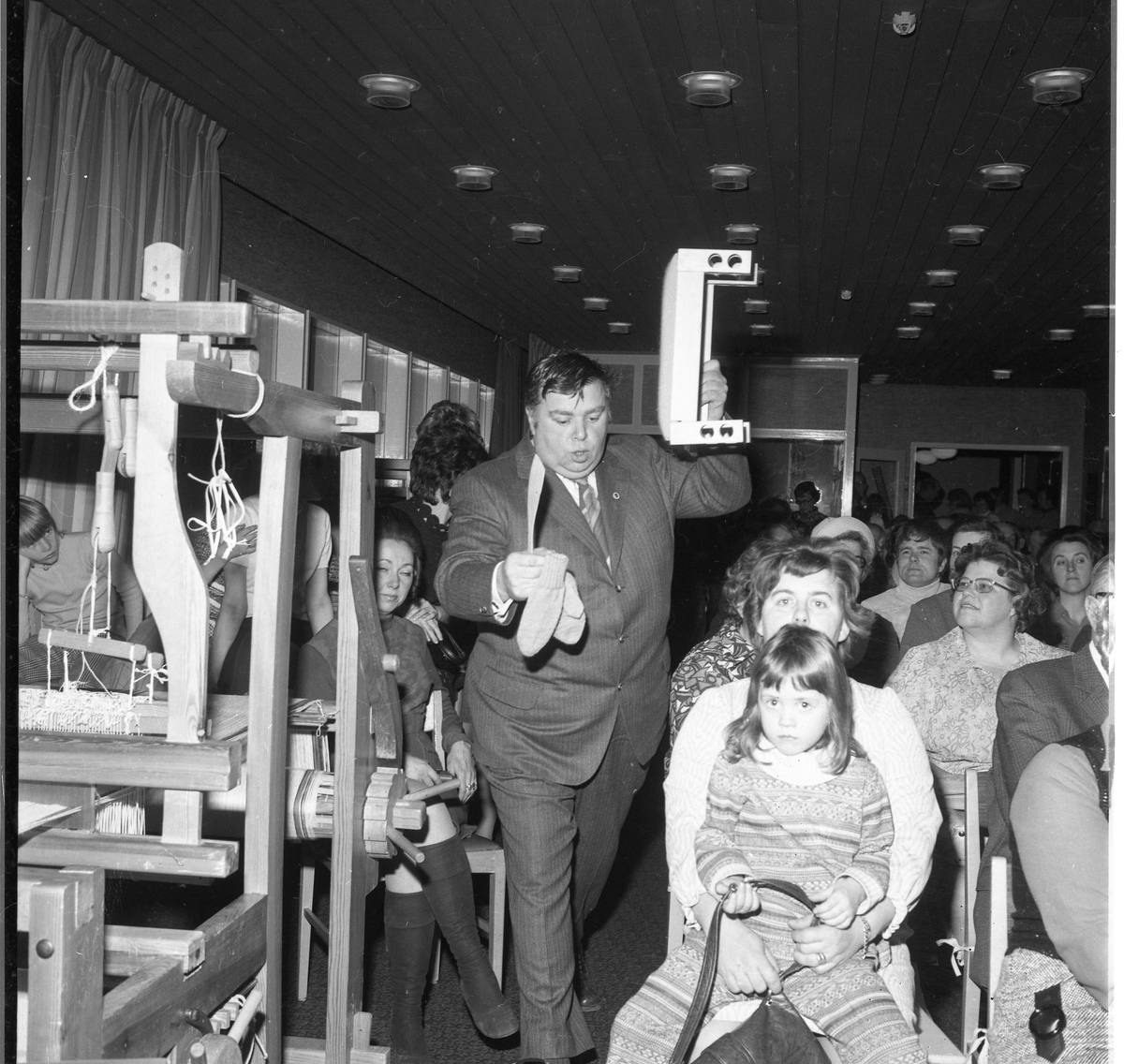 En man med auktionsprylar i händerna i en trång passage mellan sittande publik och en vävstol.