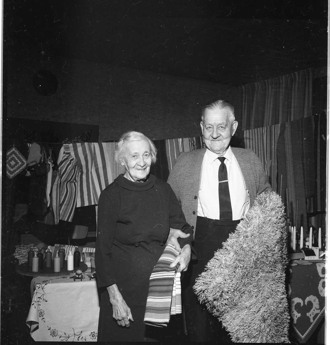 En äldre kvinna och man med textilt hantverk. De håller om varandra.