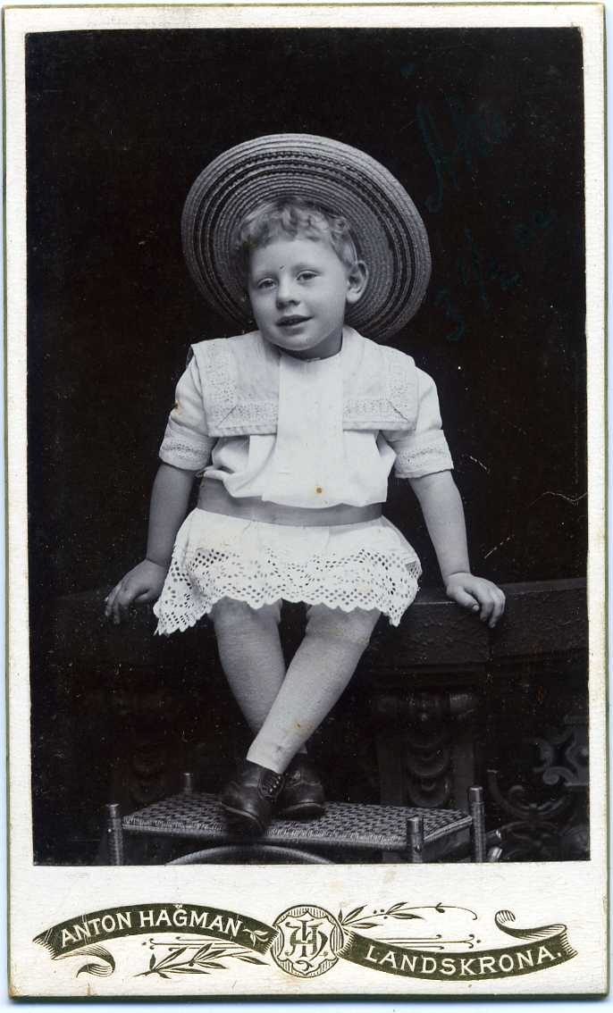 Porträtt av en liten pojke med stråhatt som sitter på ett räcke.