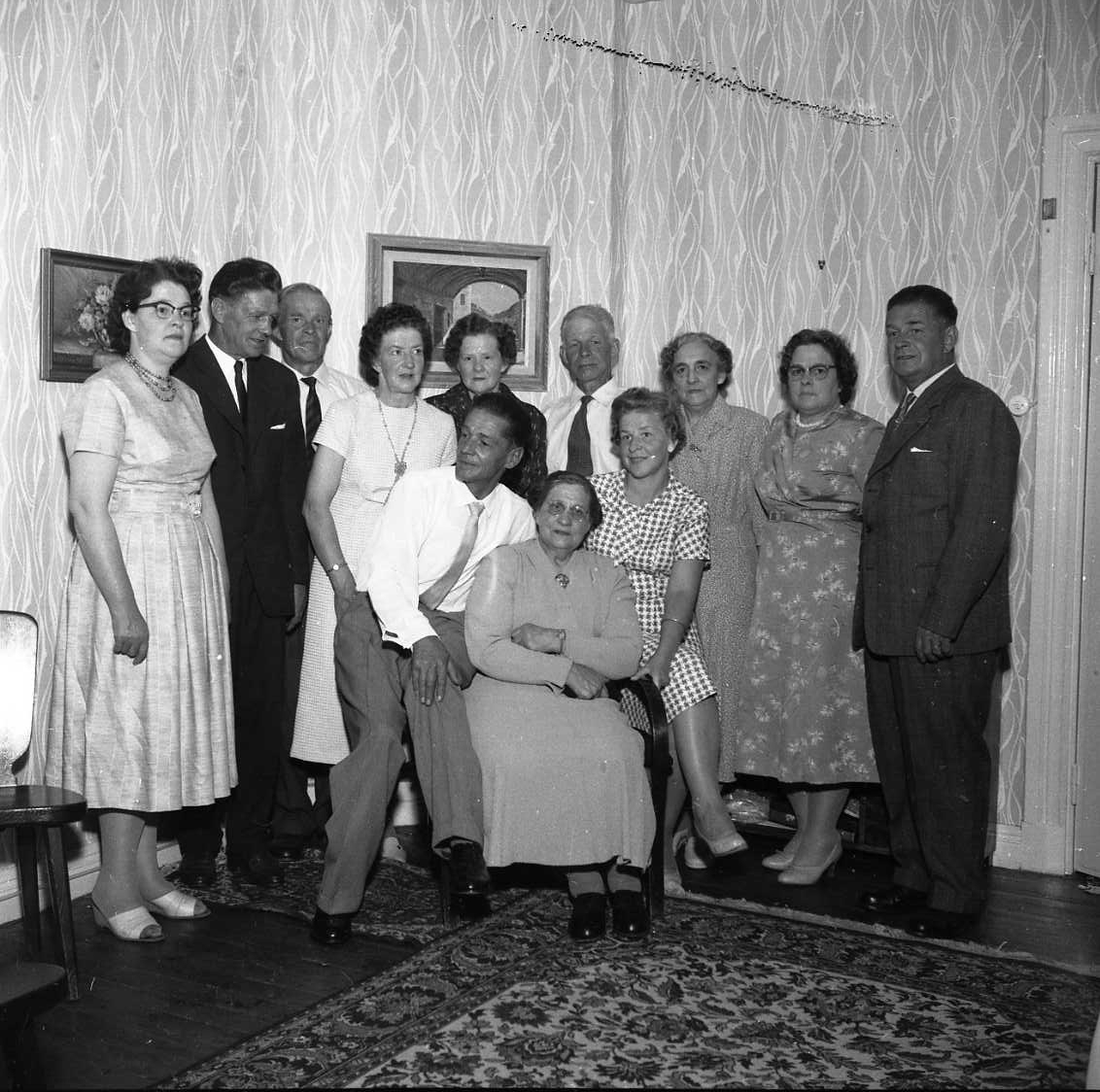 Gruppbild med okänt sällskap av män och kvinnor i ett hem.
