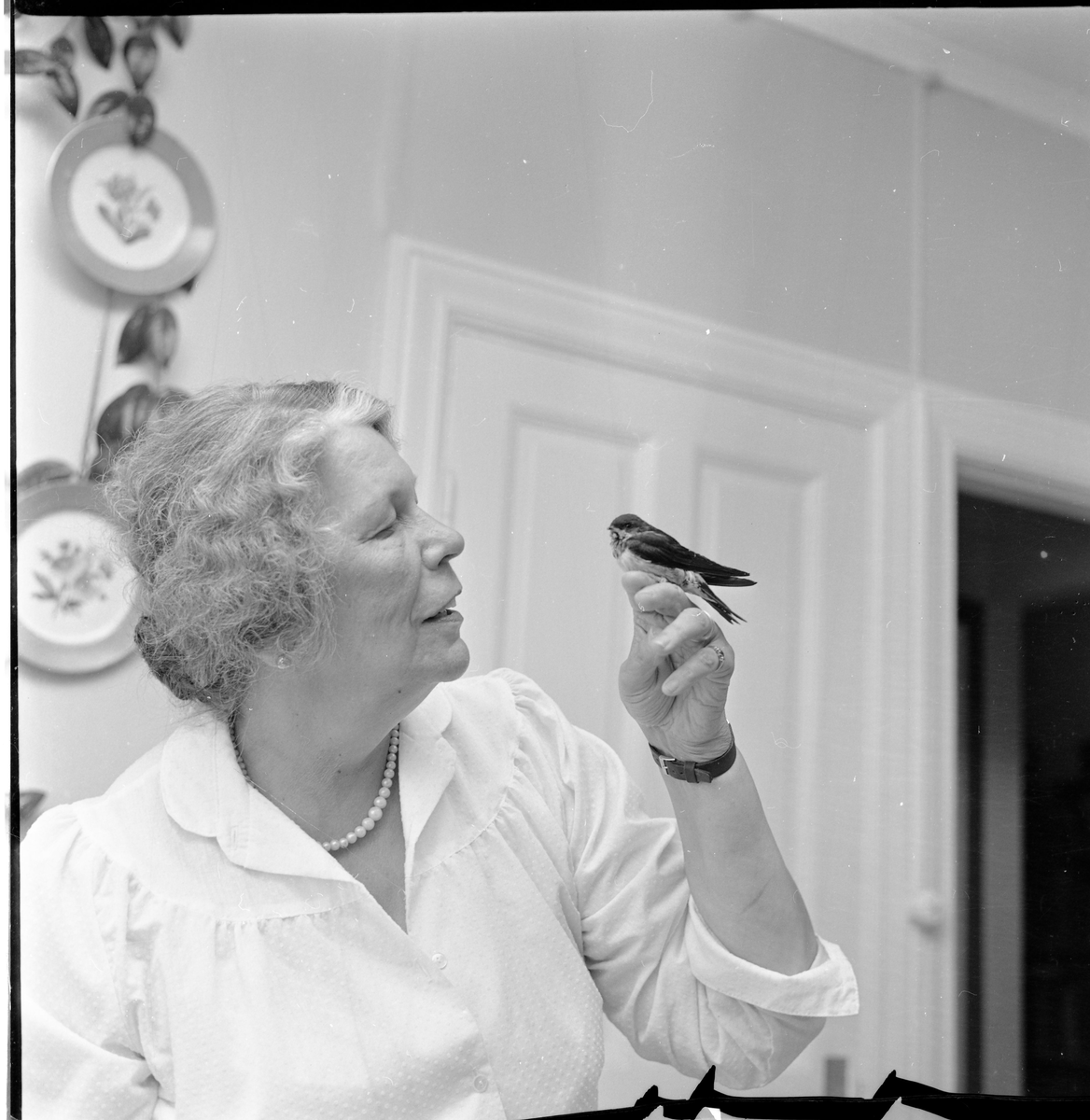 En kvinna i sitt hem. En fågel, en hussvala, sitter på hennes hand.
