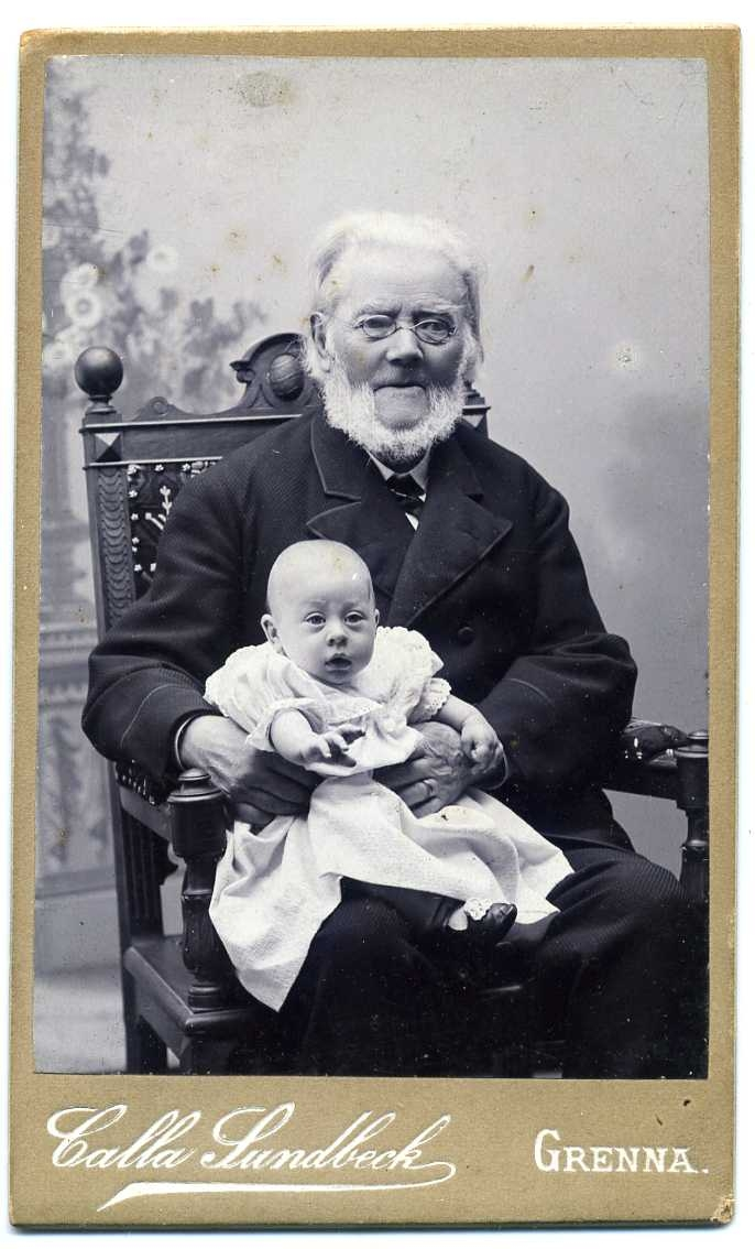 Porträtt av en äldre man skägg och glasögon som sitter på en stol med ett spädbarn i knät. En morfar med barnbarn.
