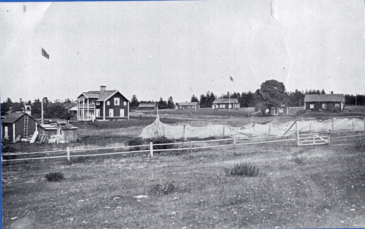 Limö fiskeläge som är inhägnat med en storryssja på Gistvallen. I bakgrunden lite till höger står Limöns vårdträd, lönnen, vid "Lillstugan", 1915.