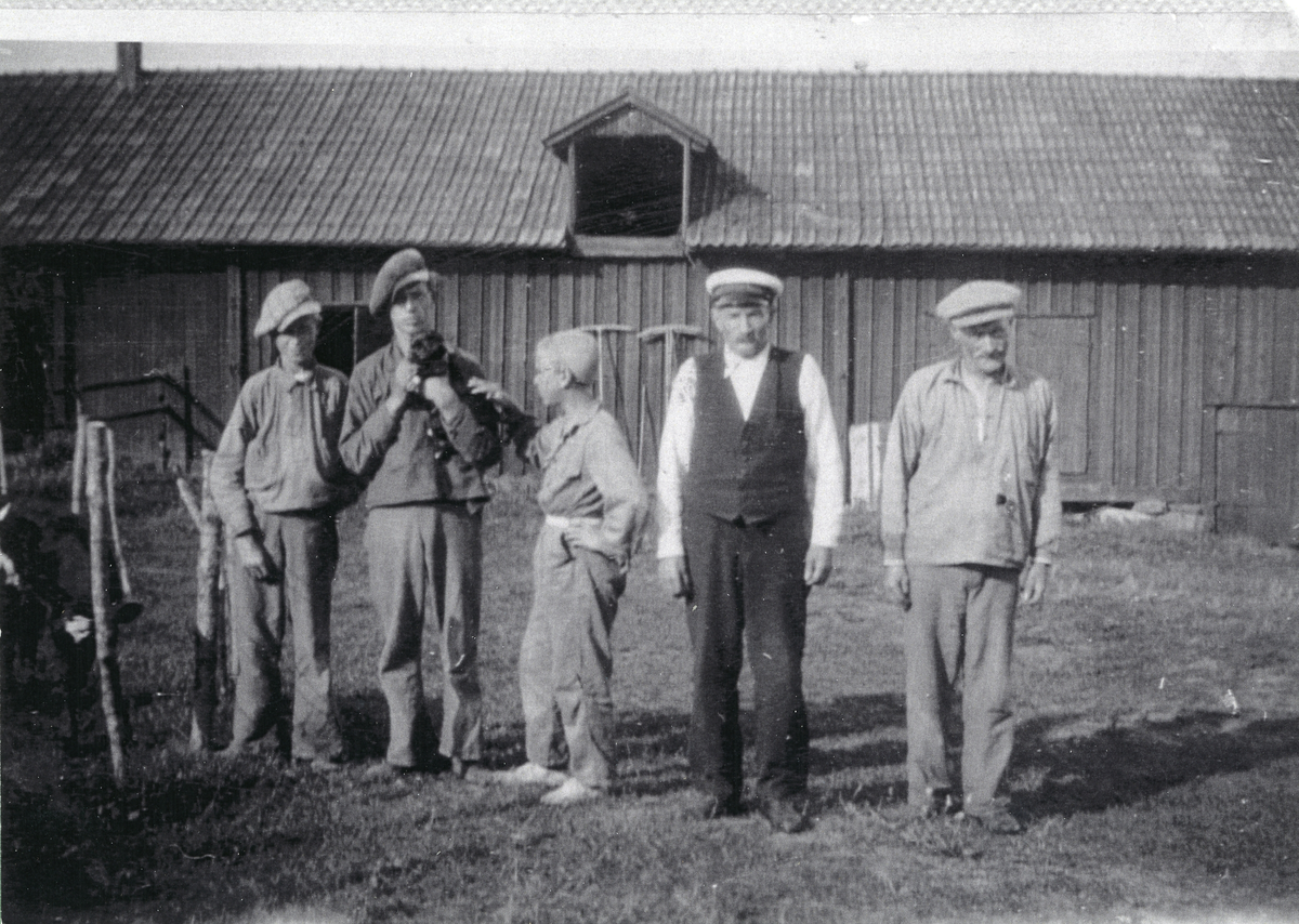 Arrendator Carl Eriksson och fiskare Axel Hillberg till höger samt tre personer till vänster, varav den i mitten håller i en valp, står framför en lång byggnad, 1929.
