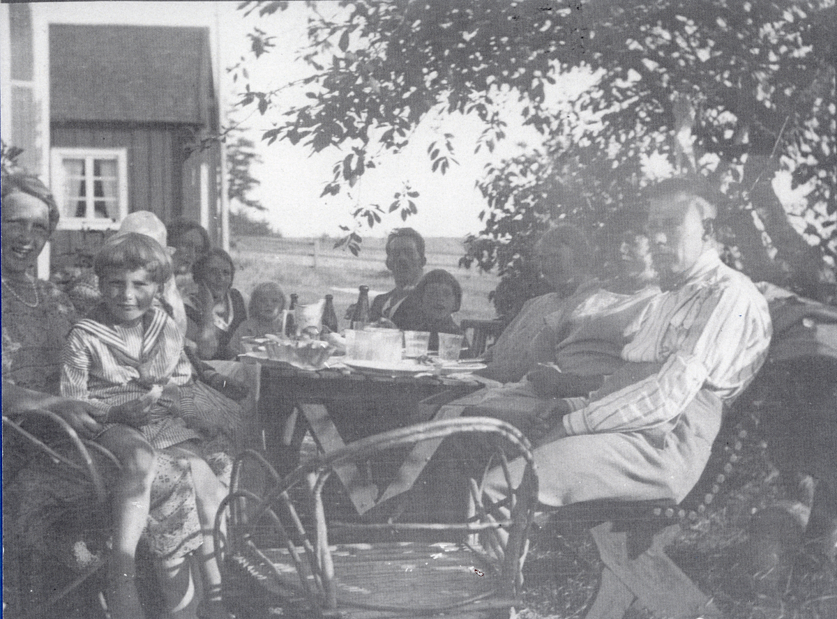 Män, kvinnor och barn som sitter till bords i arrendatorns berså, 1925.