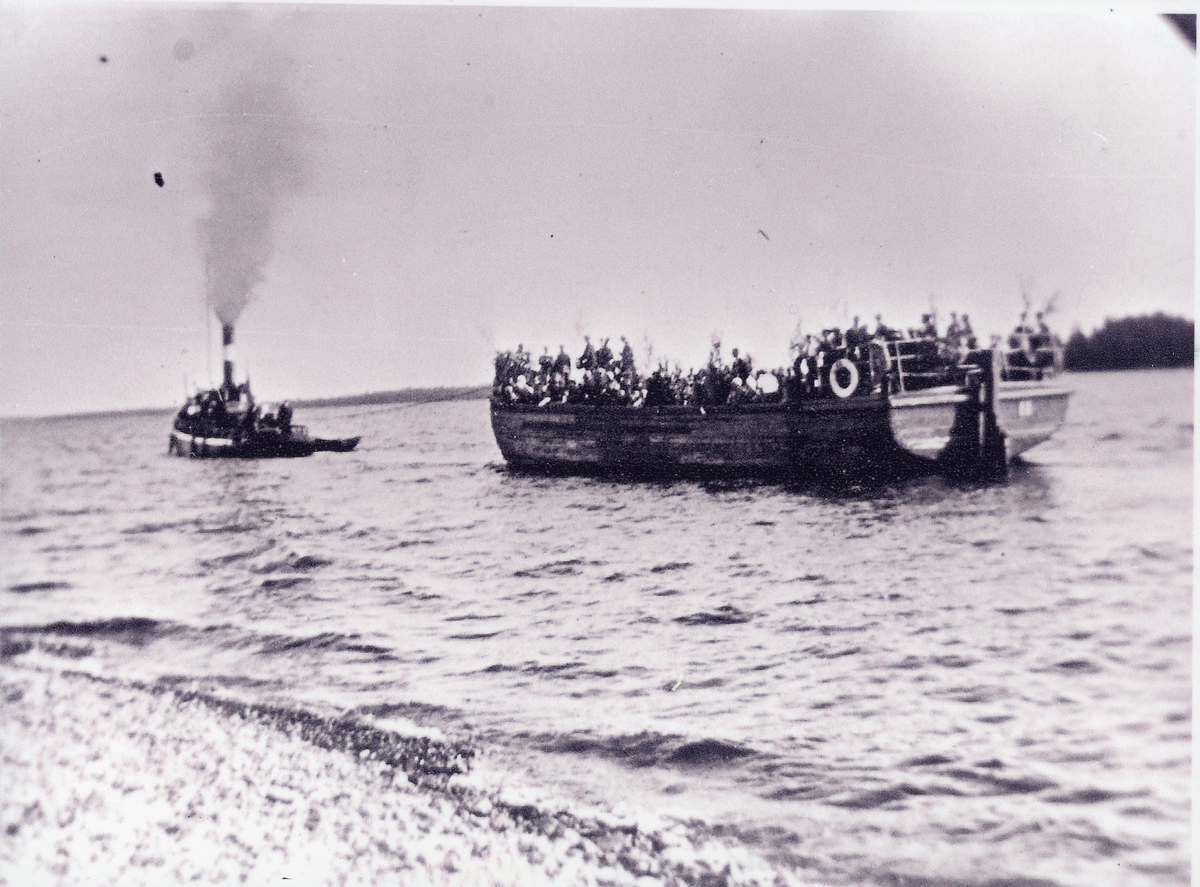 Efter utflykt med lövad pråm till Limön, bogsering med båten "Alert" tillbaka till Kastet, 1920-tal.
