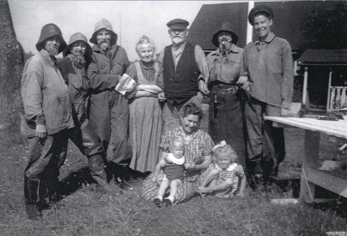 Bild på "Fiskargubbar" med Grönqvists i mitten och sittande framför på gräset en kvinna med två små barn.