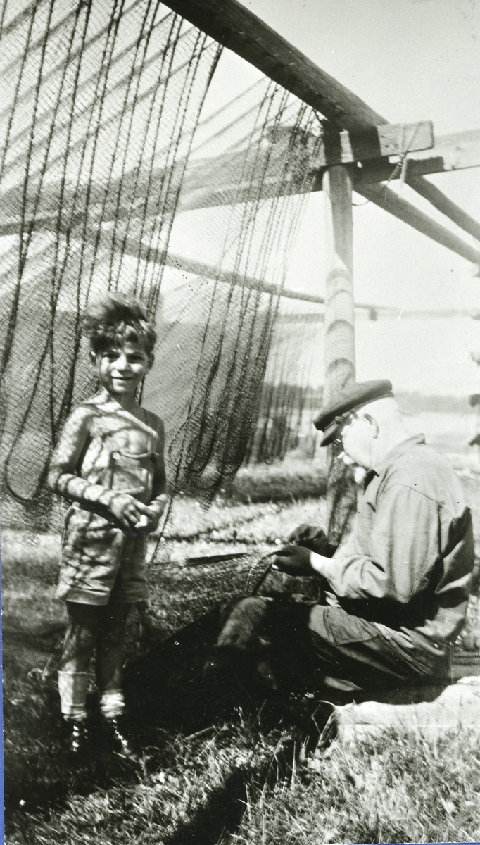 Wilhelm Grönqvist sitter på en sten och lagar skötar medan Christian tittar på.