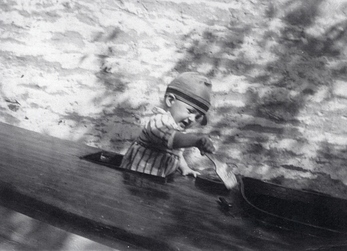 Olle, med moddlare i handen sittande i kanoten, 1920.