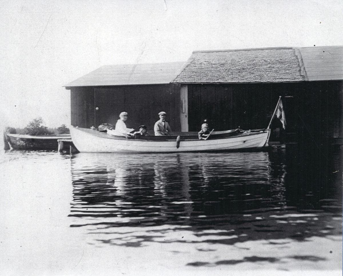 Pelle Lundgrens motorsnipa med fyra personer som kanske ska ut och fiska, 1920-tal.