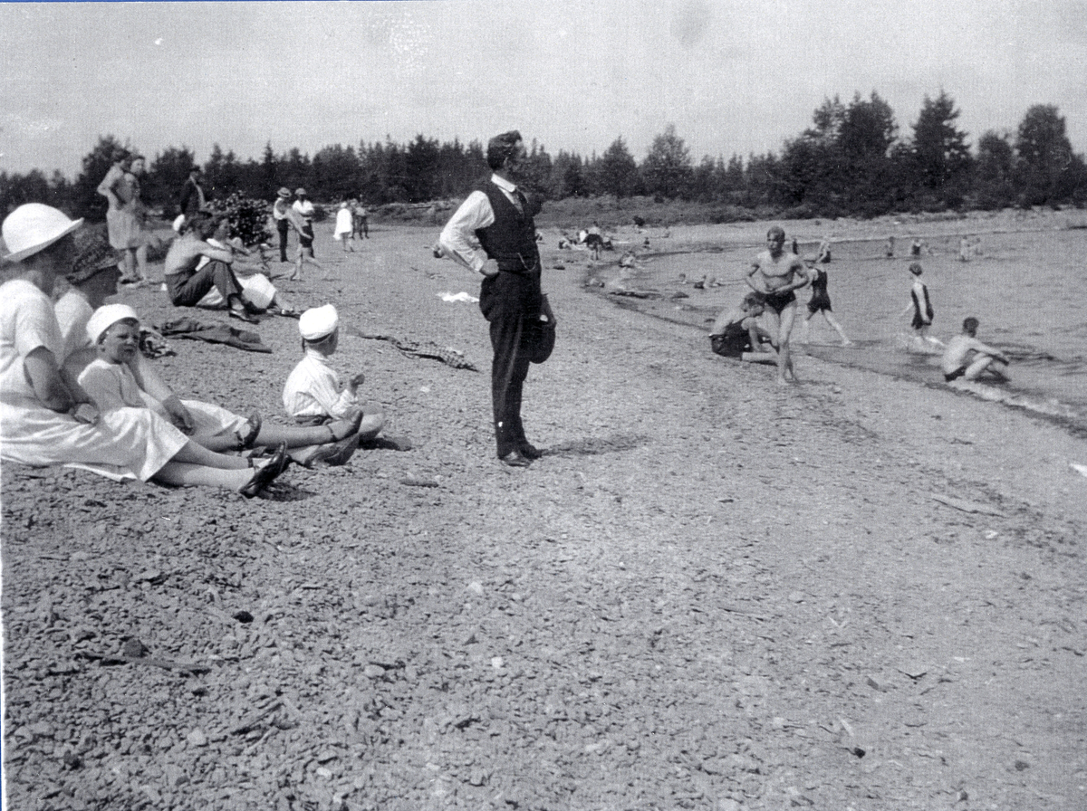 Folk som solar och badar vid Tärnviken, fr.v Ninni Berglund, Karin Lundgren m sönerna Sven och Olle, stående Axel Berglund, 1926.