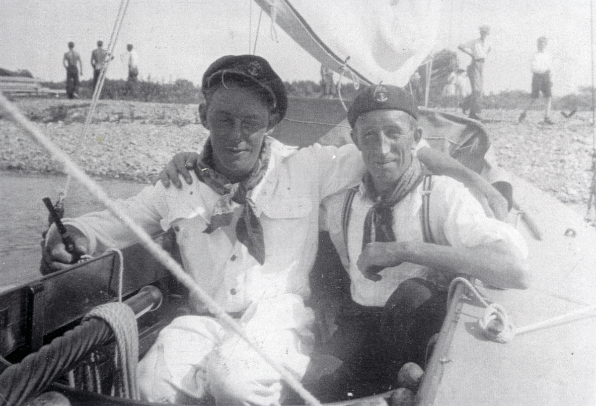Titel: Johnny Mattsson och "London" sittandes i båten "Yrhättan" vid Kalkudden. I bakgrunden syns flera människor uppe på stranden, ca 1930.