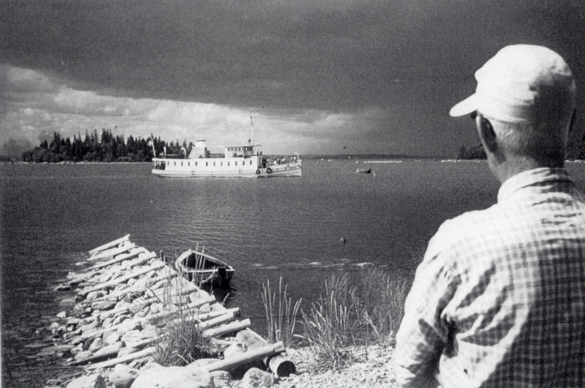 "Sommarö", med skeppare Gudmundsson anländer till Limön, man med keps står i förgrunden och tittar på när båten kommer, 1960-tal.